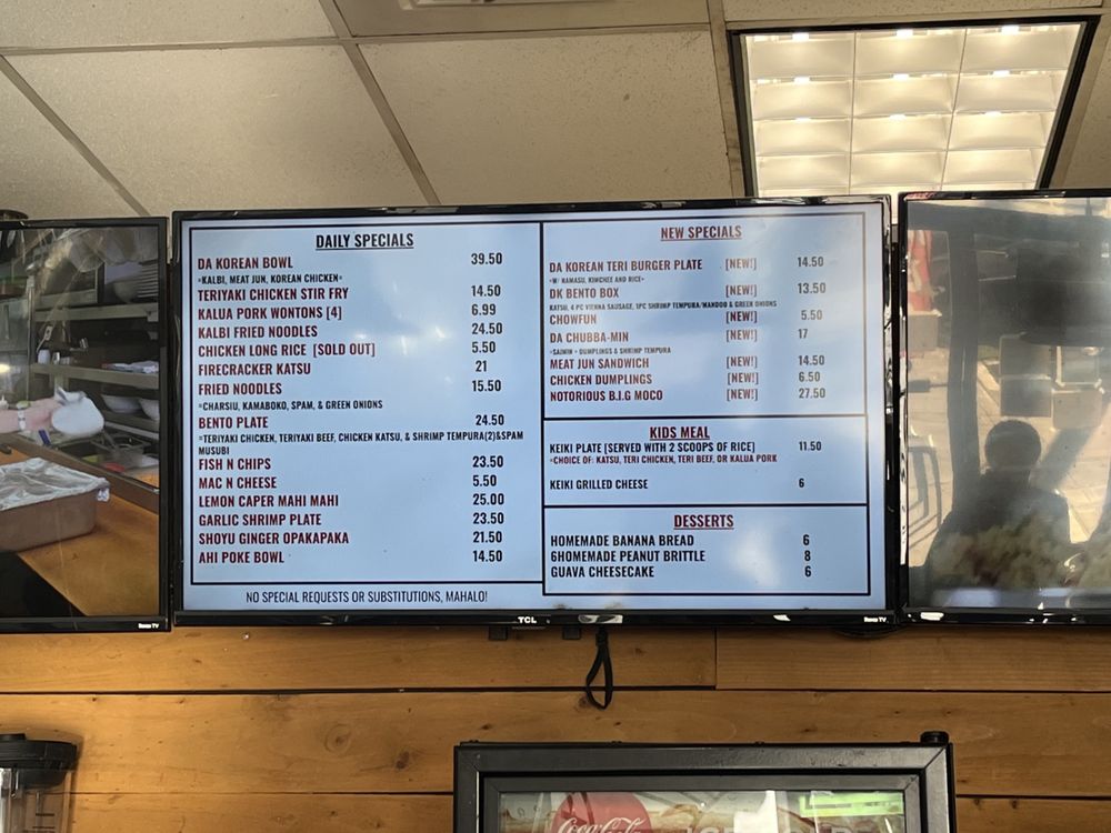 Teriyaki chicken, teriyaki beef, chicken katsu, shrimp tempura(), spam musubi
